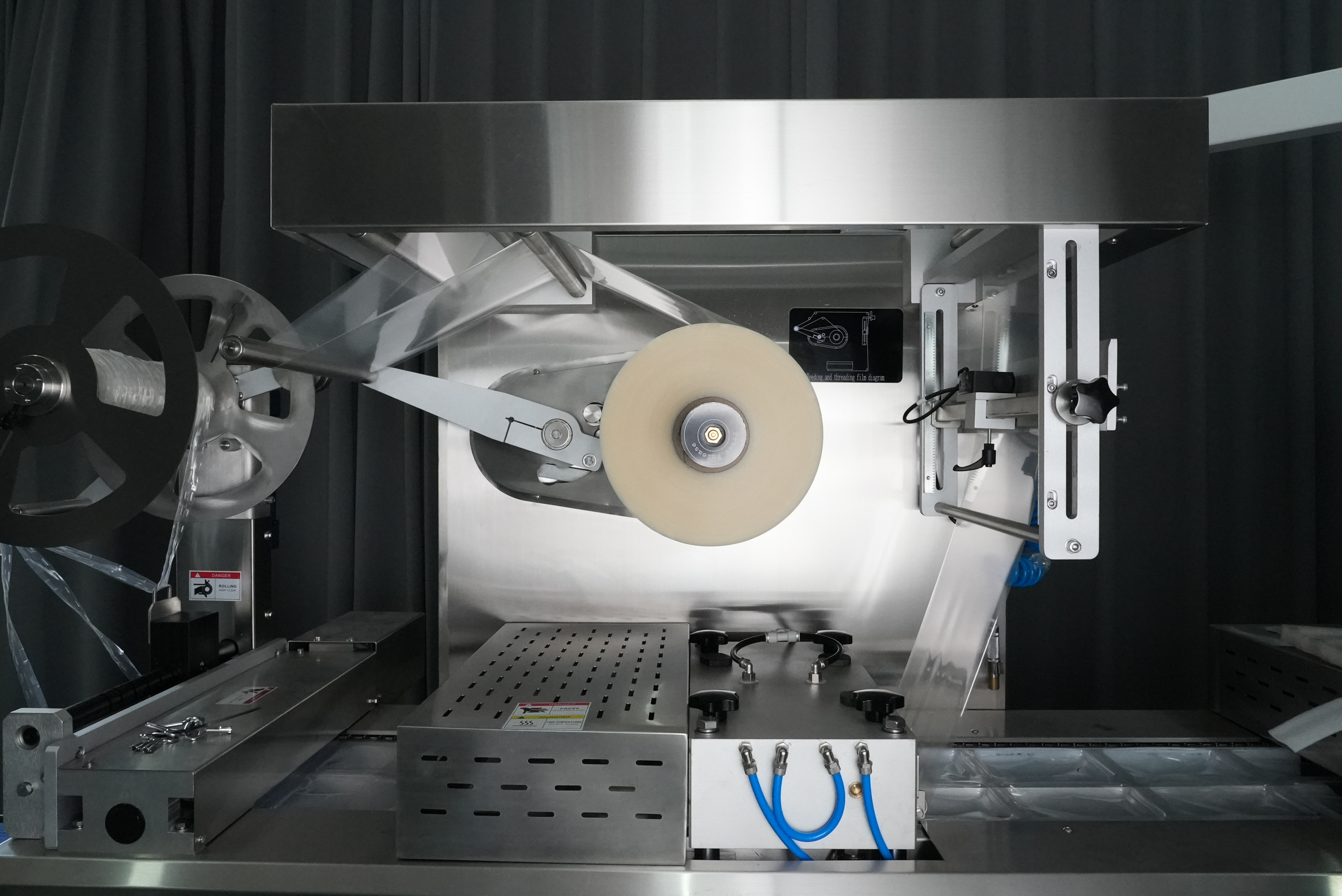 Mesin Pengemasan Thermoforming Otomatis yang Dapat Disesuaikan-Pencetakan pelabelan opsional, gaya penyegelan silang (robek bergigi/datar/mudah), dan perangkat makan otomatis.